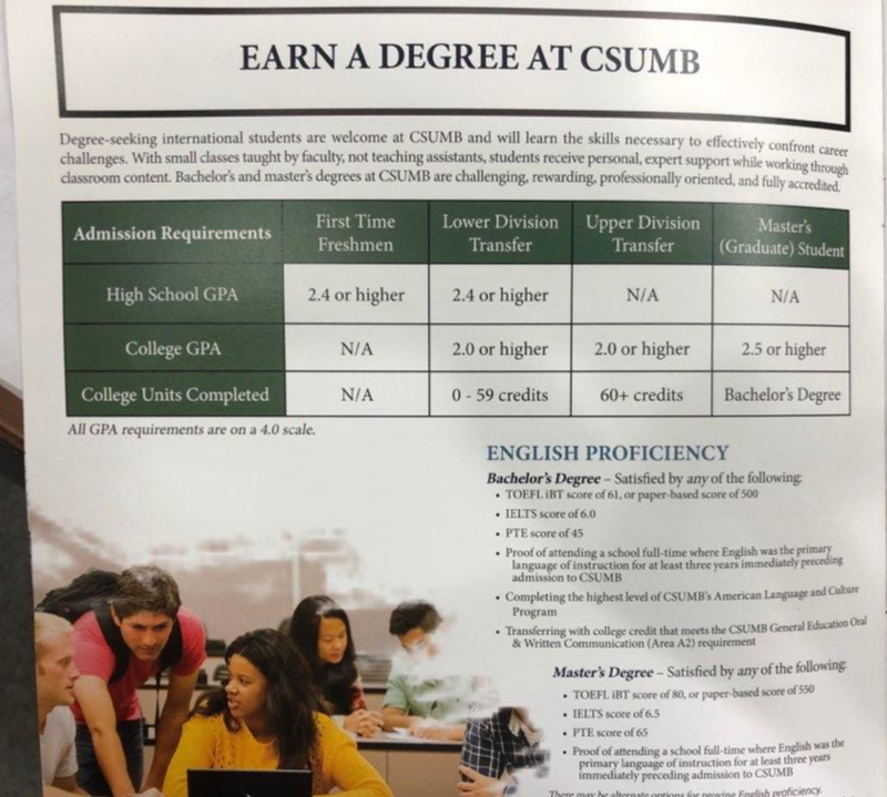 또는 CSUMB 어학 부설 과정 연수 통과 경우 위 영어 점수 면제