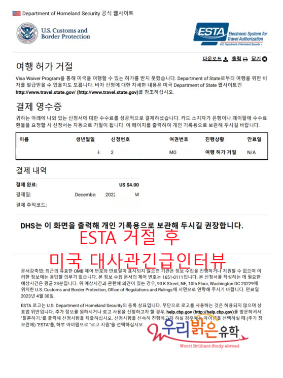 ESTA 거절 후 긴급관광 인터뷰 승인사례