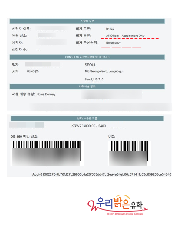 추가적으로 개인서류 보강후, 미국대사관 인터뷰는 한글지원이 가능하기 때문에 통역또는 미국영사의 한글인터뷰가 가능하였습니다.개인 서류를 잘 보강하여서 긴급승인된 인터뷰날 10분 미만의 짧은 인터뷰로 아래와 같은 결과를 받게 되었습니다.