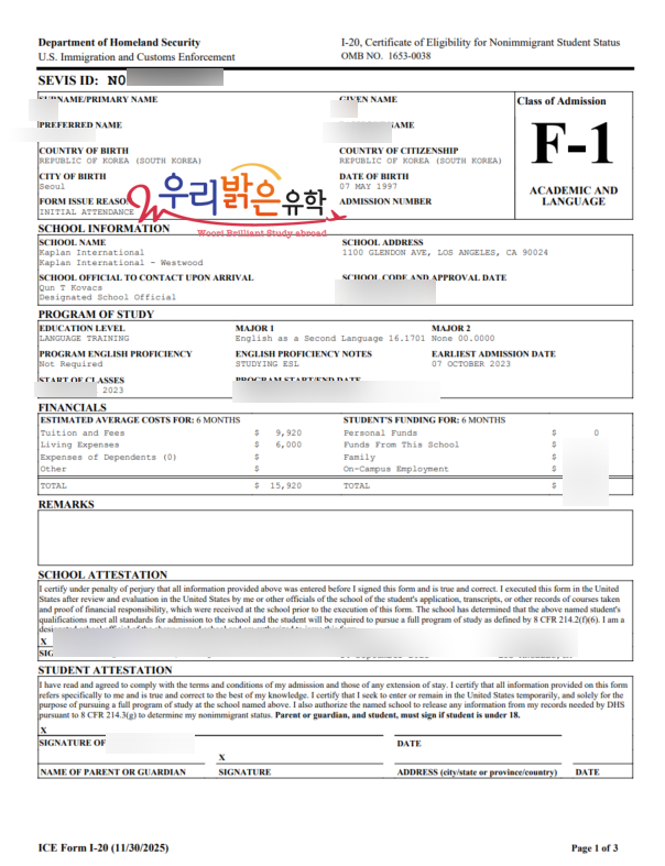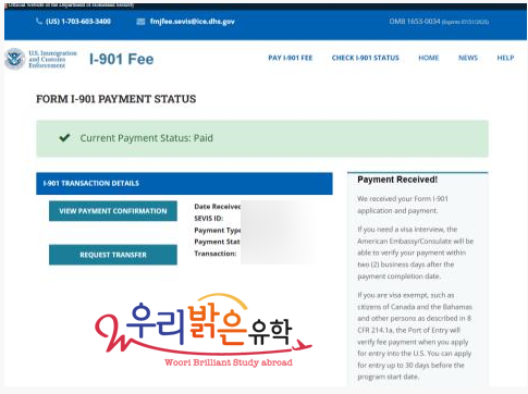 SEVIS FEE 유지 ( 어학원을 변경하게 된다면 추가로 350$ 납부없이 변경이 가능합니다)